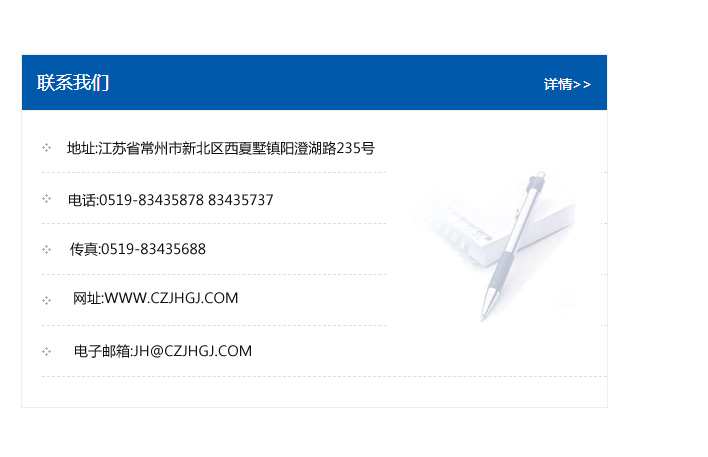 地址:常州市新北區友邦商務大廈1幢16、17層  電話:0519-85101652  傳真:0519-85112595  郵編:213022  網址:www.cz-jiayue_cn.chqkjsm.com  郵箱:xiajifengaa@163.com